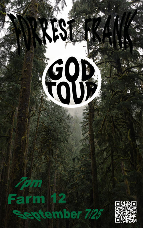Description: The poster for "God Tour" by Forrest Frank features a moody forest background and bold, curved typography that matches the natural, spiritual theme. Its strengths include an atmospheric design, clear event details, and a modern QR code. However, the green text is somewhat hard to read against the background, and the hierarchy between the artist’s name and event title could be improved. Clarifying the date format and balancing the layout would enhance its overall effectiveness.